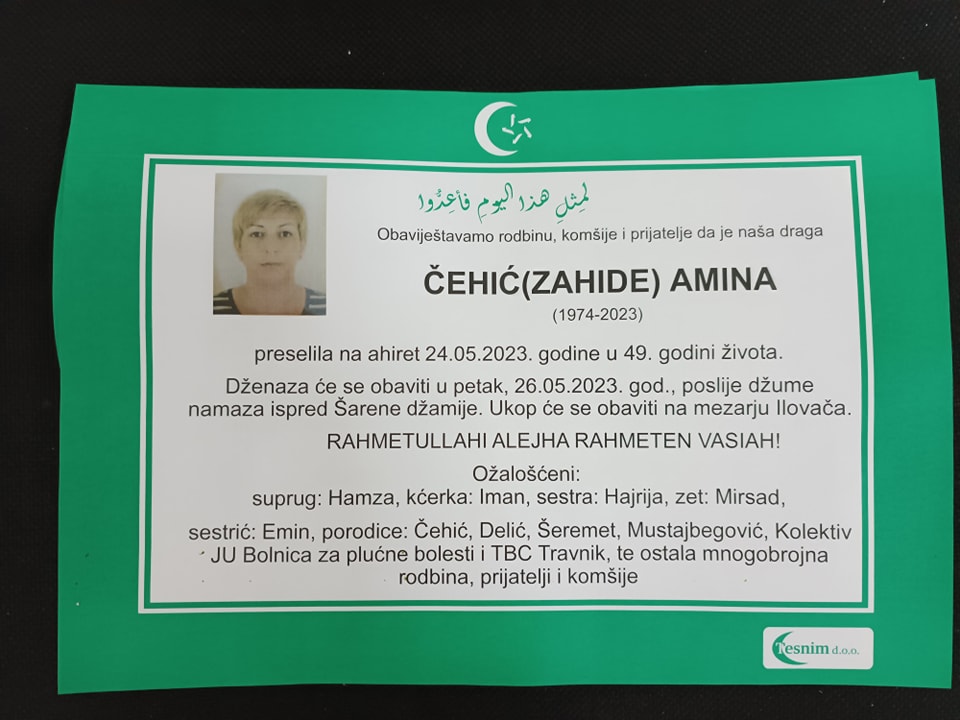 Dana 24.05.2023. godine u 49. godini života na bolji svijet je preselila naša draga kolegica Amina Čehić.